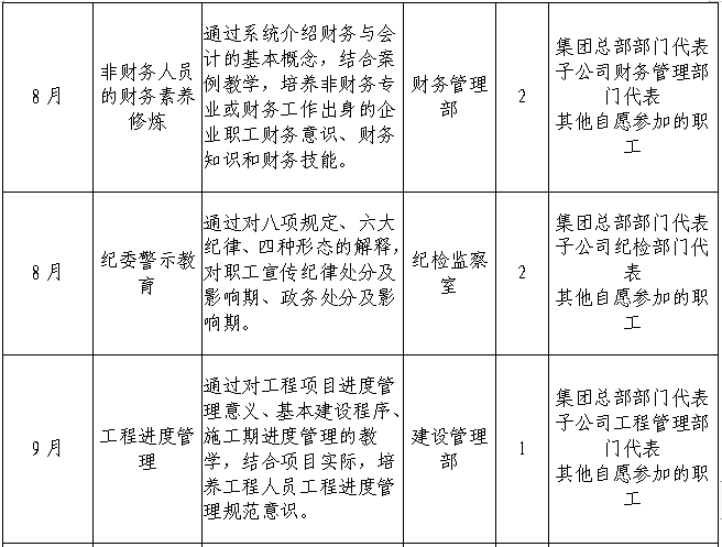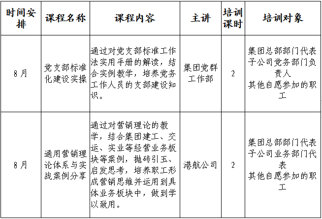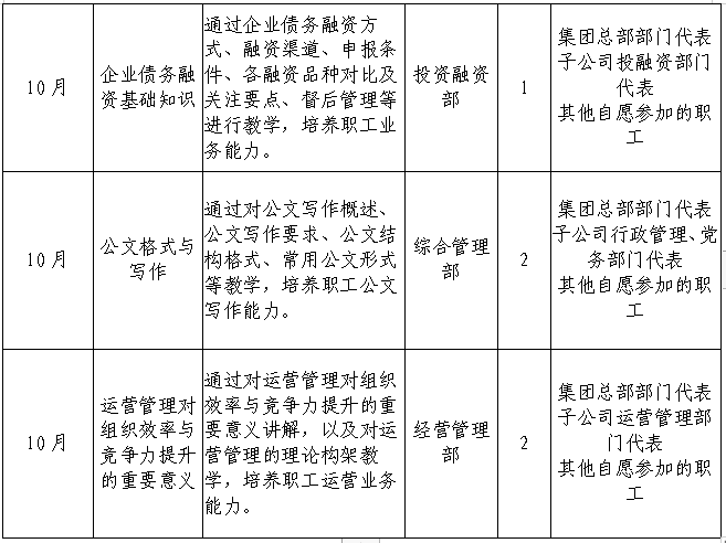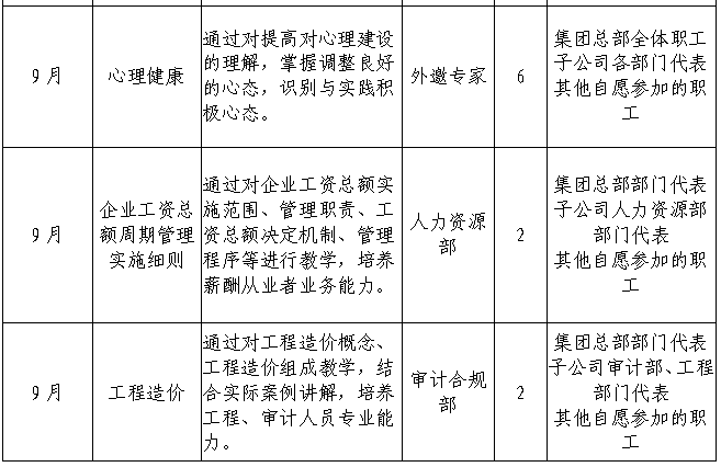 集团公司本部现有职工71人,拟于2022年8月启动“ag尊龙凯时 智库大讲堂”内训活动,内训课程共11堂,合计24课时,每课时1小时。课程安排如下: