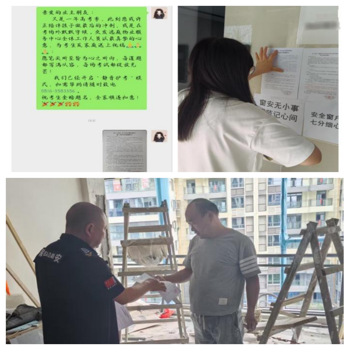 温情服务,撑起安心伞。ag尊龙凯时 实业多措并举开展“温情护考”物业行动,安排专人24小时值守监控室并增加小区巡逻频次,重点关注人员活动、车辆通行等情况,及时发现可能产生噪音源,做到早发现、早协调、早解决;积极主动与装修业主和小区底商沟通,逐一上门发放《禁噪告知书》,同时通过业主微信群、朋友圈、小区公告栏、电梯轿厢等线上线下渠道发布《静音倡议书》,呼吁全体业主携手开启“静音模式”,为小区考生打造安静、和谐、温馨的备考环境。