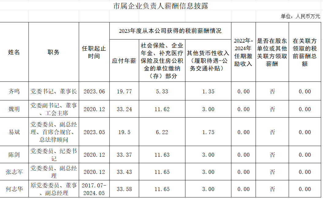 市属企业负责人薪酬信息披露