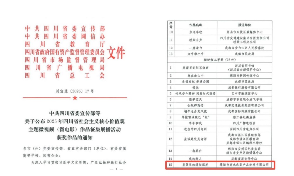 近日,由四川省委宣传部联合省委网信办、省国资委、省总工会等七部门主办的“2025年四川省社会主义核心价值观微视频(微电影)作品征集活动”评选结果正式公布。高农司报送的的纪实微视频——《菜篮里的绵阳温度》,从全省数千部参赛作品中脱颖而出,荣获三等奖,系绵阳市国资系统唯一获此殊荣的民生题材作品。