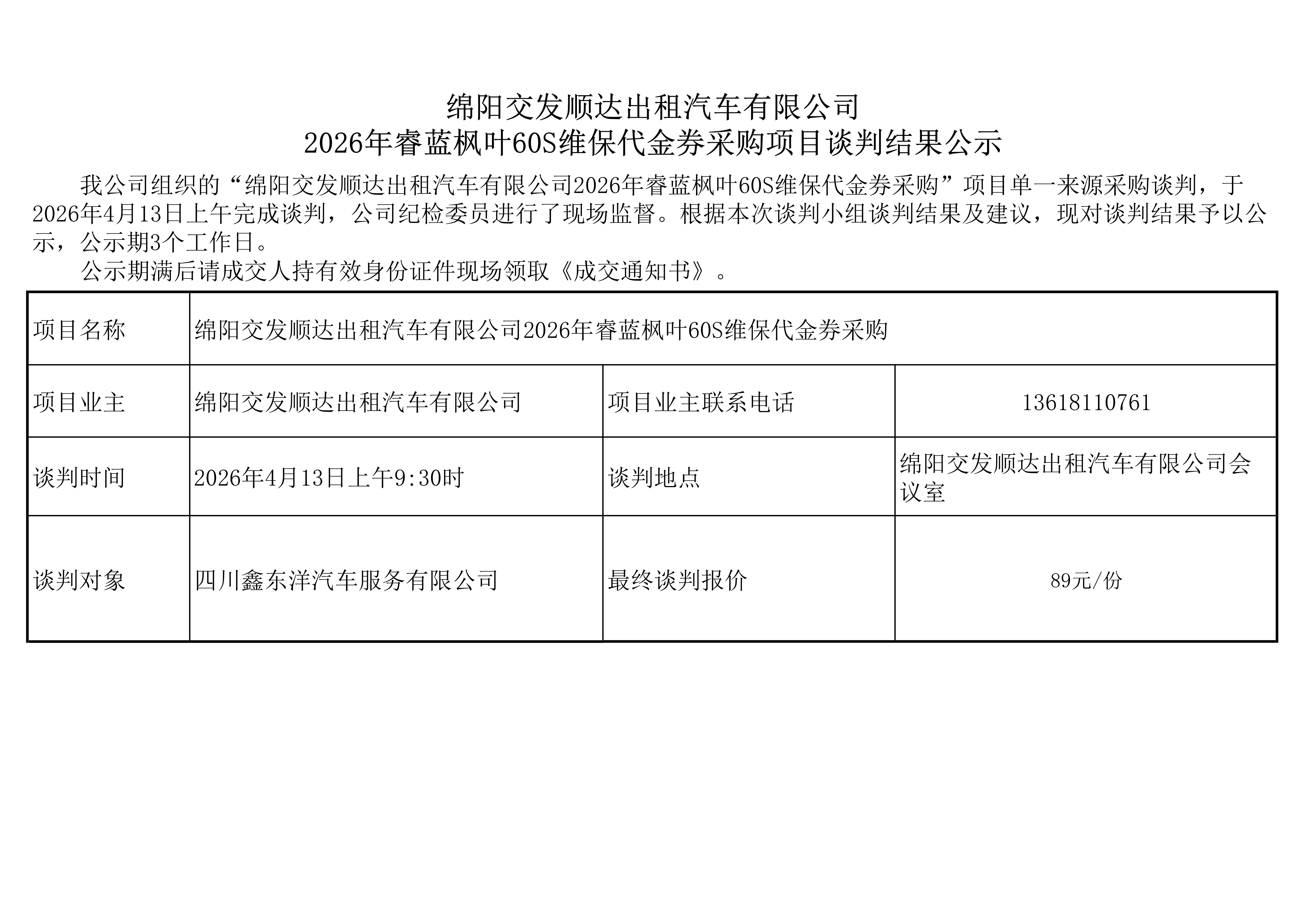 ag尊龙凯时 顺达出租汽车有限公司 2026年睿蓝枫叶60S维保代金券采购项目谈判结果公示